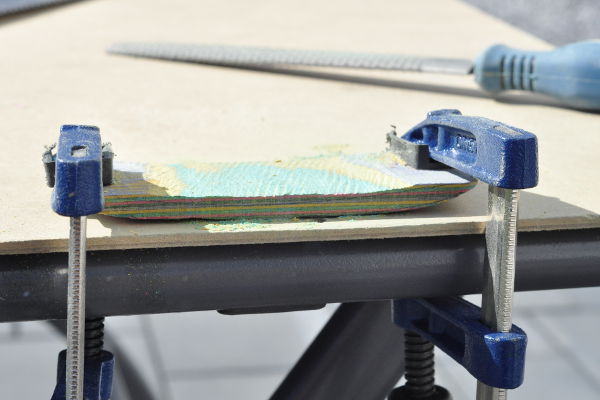 Ich habe mir im Baumarkt eine Raspel und 2 Schraubzwingen gekauft und losgelegt.