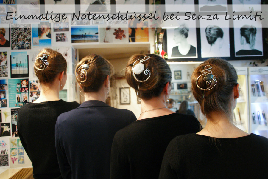 Eigentlich ist ein ähnliches Bild zufällig entstanden als Nessa ihre Sonderanfertigung und Heike und ich gleichzeitig zwei andere Einzelstücke ausprobiert haben. Nickike hat sich dann noch einen Notenschlüssel mit Muranoglas in den Dutt gebastelt und wir haben versucht das Dreierbild noch zu übertreffen. Mir gefällt der ursprüngliche Schnappschuss eigentlich besser…